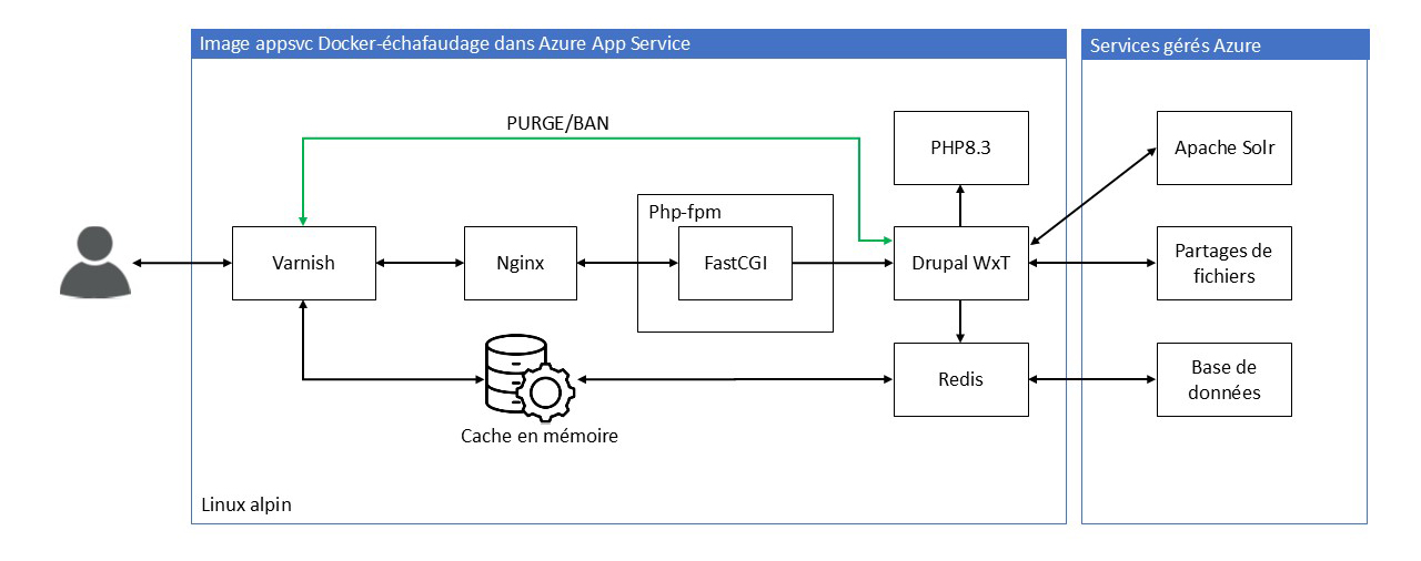 Le projet docker-scaffold, et plus particulièrement l'image appsvc, fournit une solution complète et optimisée pour le déploiement d'applications Drupal WxT sur Azure App Service. En regroupant Nginx, Redis, Varnish et PHP-FPM dans un seul conteneur, l'image appsvc simplifie le déploiement, améliore l'évolutivité et les performances.